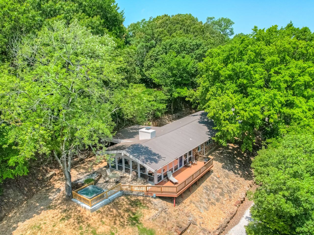 Tucked away in Paradise Hill on a secluded, wooded lot, this property was completely renovated in 2024 and comes with a peekaboo view of Lake Tenkiller from the new hot tub. It's a 6 minute drive to Strayhorn Marina, an 18 minute drive to Burnt Cabin Marina, and less than a mile to Soda Steve’s. Also, about 35 minutes from river floats. Relax inside with family board games, cook a meal in the fully stocked kitchen, or just unwind in front of the Roku TV with 1 gig internet speed.